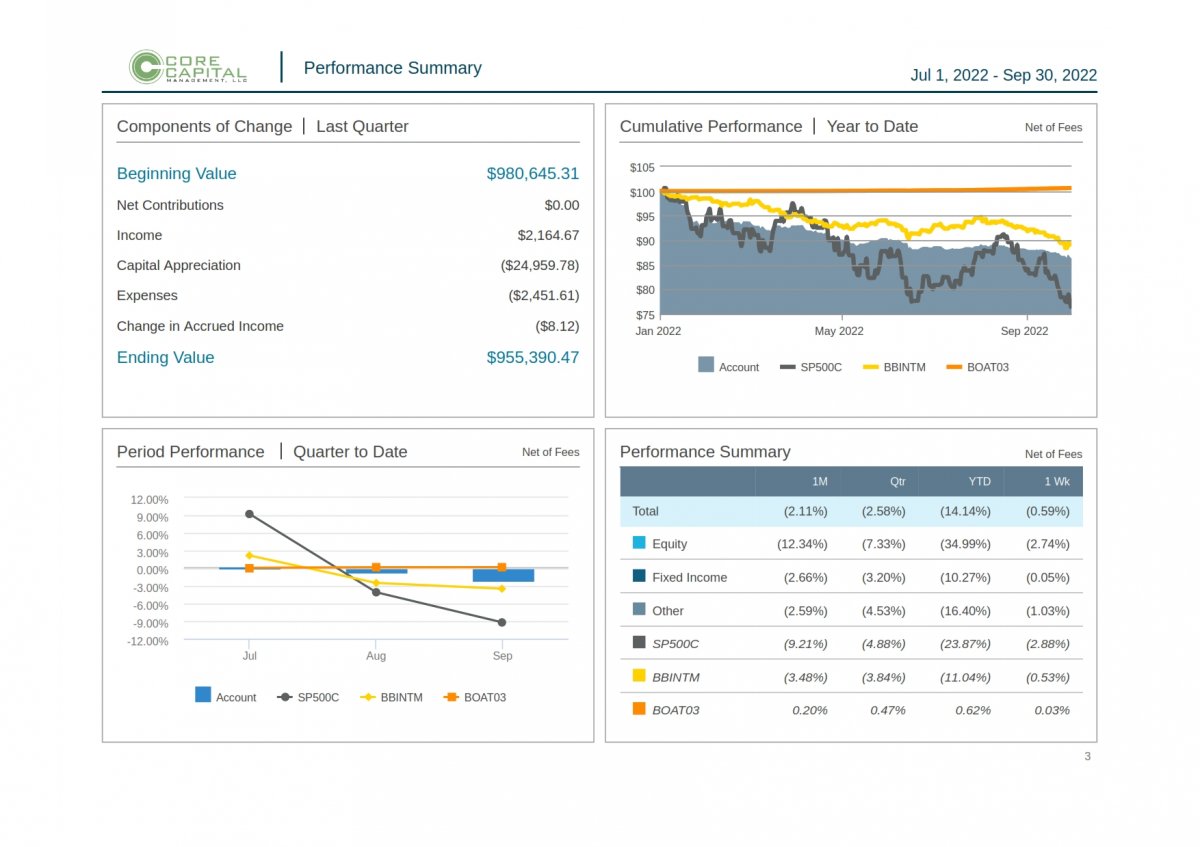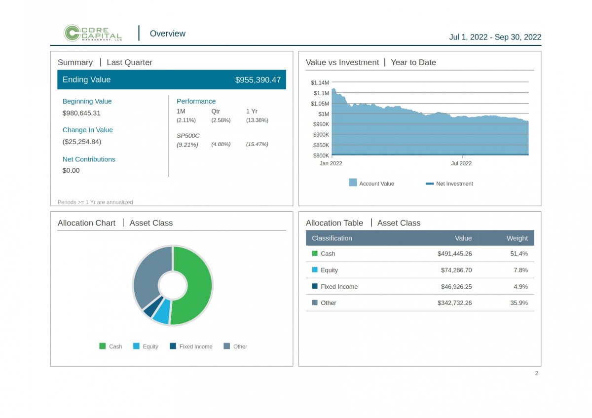 Investment Management Fees are charged on an annual percentage of assets under management, billed quarterly in arrears. The typical fee schedule is as follows: Under $1,000,000 = 1.25%